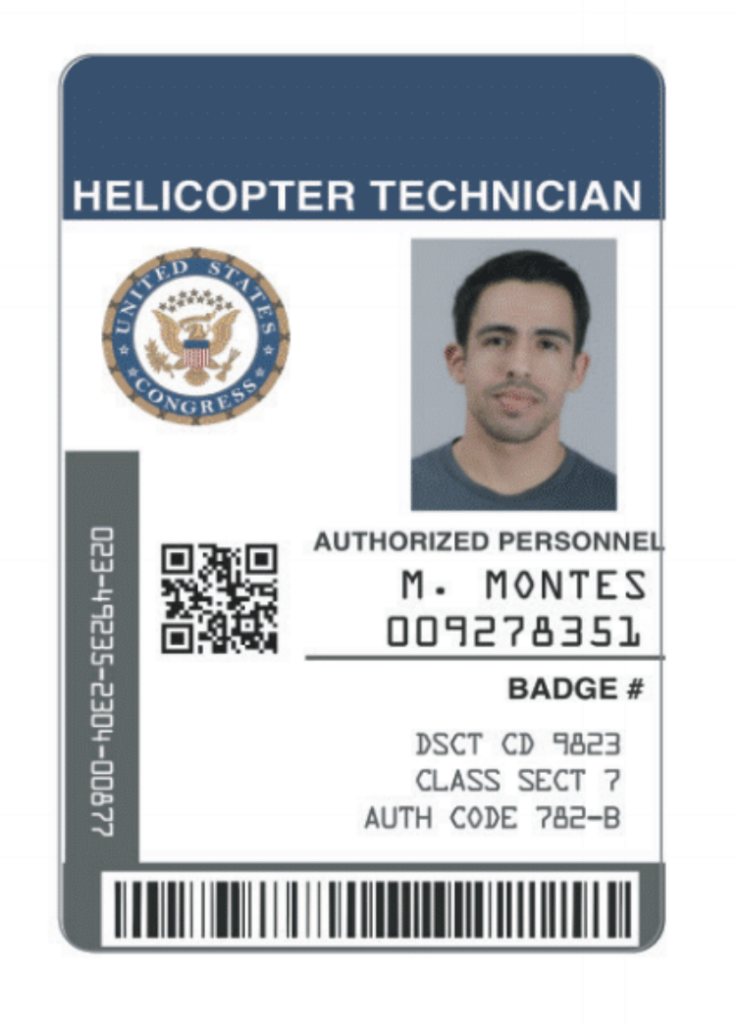 ID badge for a helicopter technician with photo, QR code, and security details.
