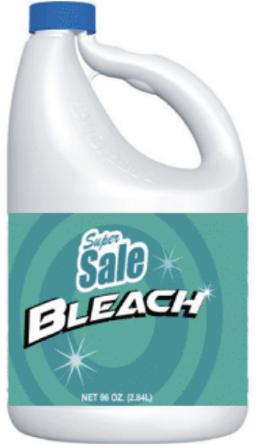 Graphic of a bleach bottle labeled 'Super Sale' with a teal design.