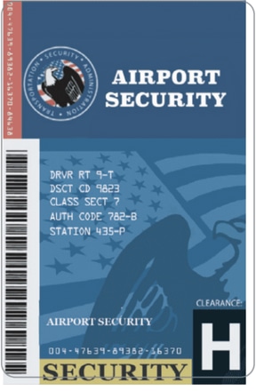 Illustration of airport security badge with codes and symbols. Features blue and black colors.